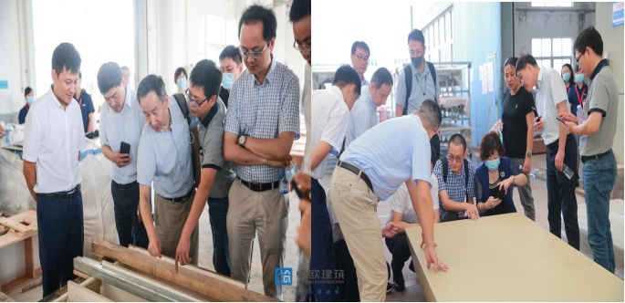 上海土木工程學會副理事長兼秘書長葉國強,上海建科副總工專委會主任樊鈞,材料所副所長韓建軍等領導及專家在我司董事長劉輝、總經理汪靜及合作伙伴Ulcont優抗特?UHPC副總裁柯雄的陪同下,參觀了UHPC構件生產工廠,并觀摩了UHPC異形大板的成型工藝和過程,對我司現階段UHPC生產工作予以高度評價,并給出指導性建議與意見。
