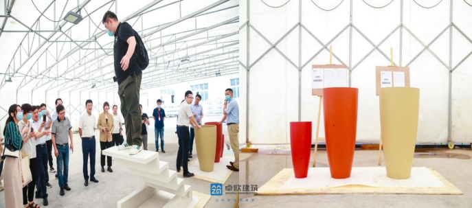 在參觀我司UHPC超高性能混凝土產品生產車間時,各位專家及參會代表對我司各種UHPC樣品及產品表現出濃厚興趣,并切身體驗了我司UHPC一體成型樓梯,對其優異質量與穩固性贊不絕口;位于樓梯一側UHPC超高性能混凝土花缽也吸引了大家的目光,該花缽是法國當代建筑大師讓·努維爾為上海恒基旭輝新天地項目設計的立面元素,恰當而又充分的利用了UHPC的超高力學性能,裝飾性能和耐久性能的特點,建成后將成為上海老城區一處亮麗優美的風景。